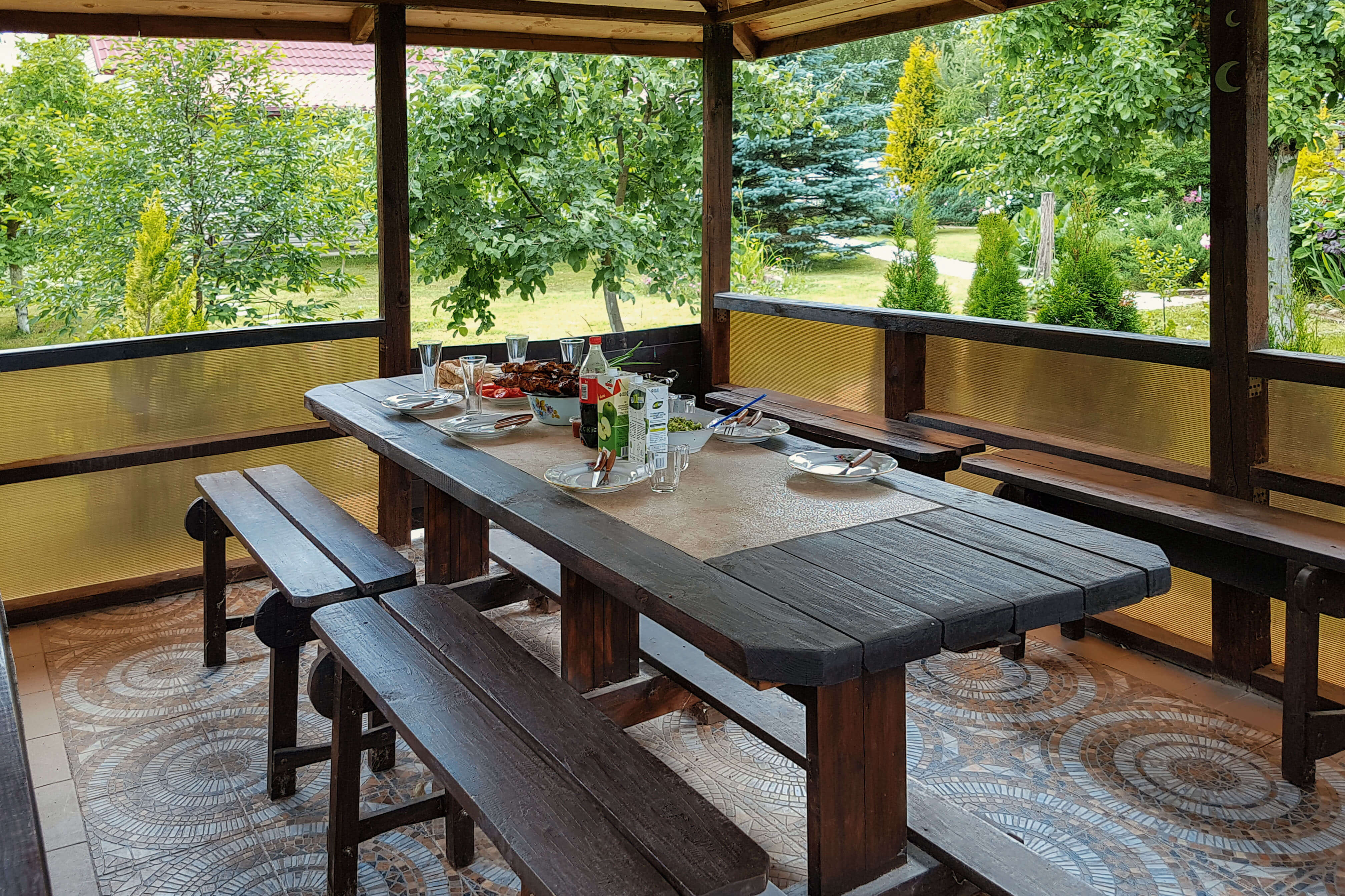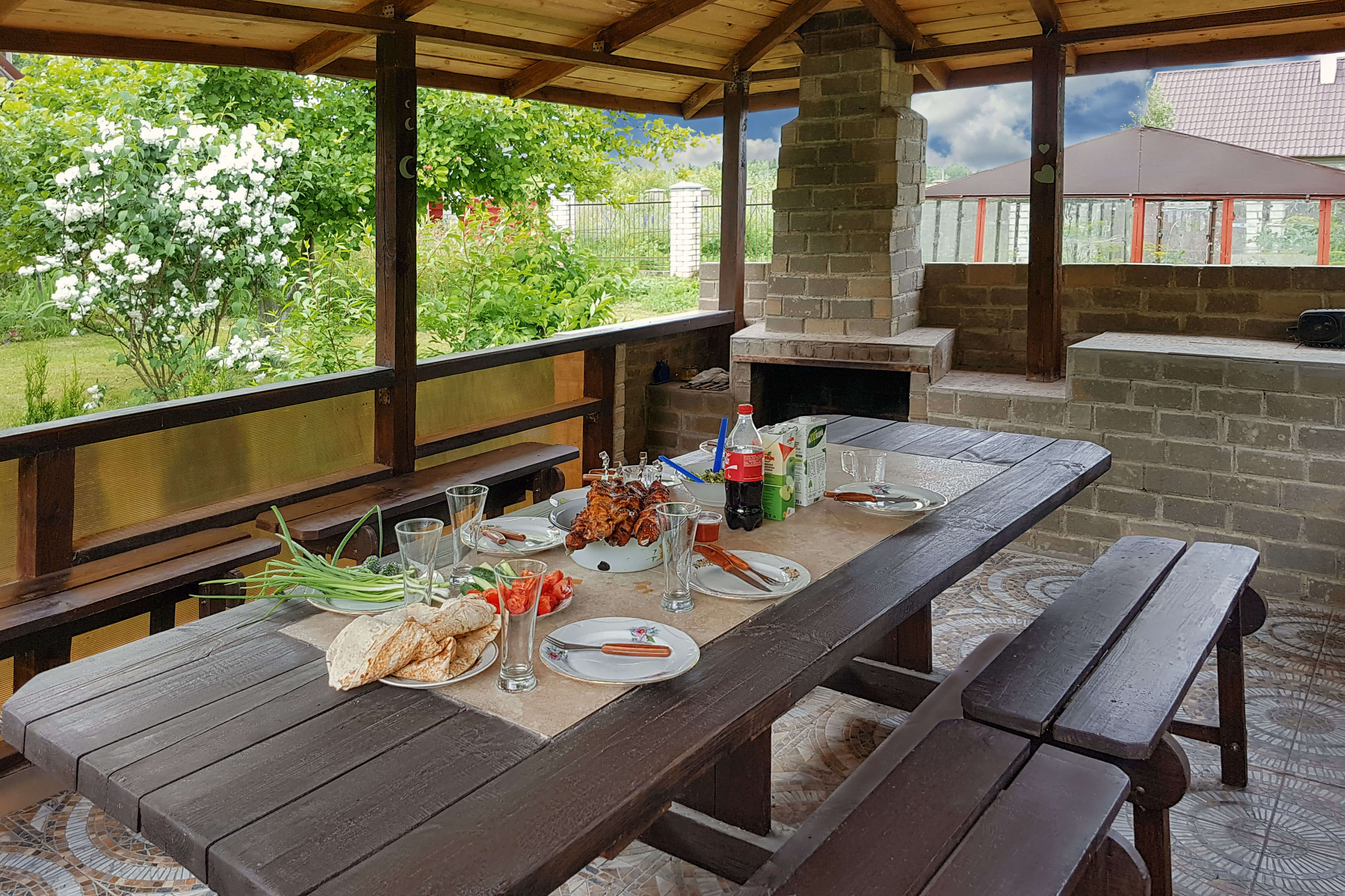 Не стоит упускать из вида и отличную беседку на 15 человек с камином, освещением и музыкой, в которой так приятно проводить вечер в саду на открытом воздухе! А если захочется отвлечься, то под рукой всегда бадминтон, дартс и настольные игры!