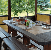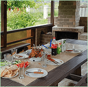 Но это далеко не все что мы можем Вам предложить! Кроме просторной веранды с мягким диваном и столом, у нас есть большая терраса с вечерней подсветкой и навесом, которая с легкостью может вместить до 20 человек. На ней так удобно и комфортно отмечать торжества или просто наслаждаться времяпровождением!